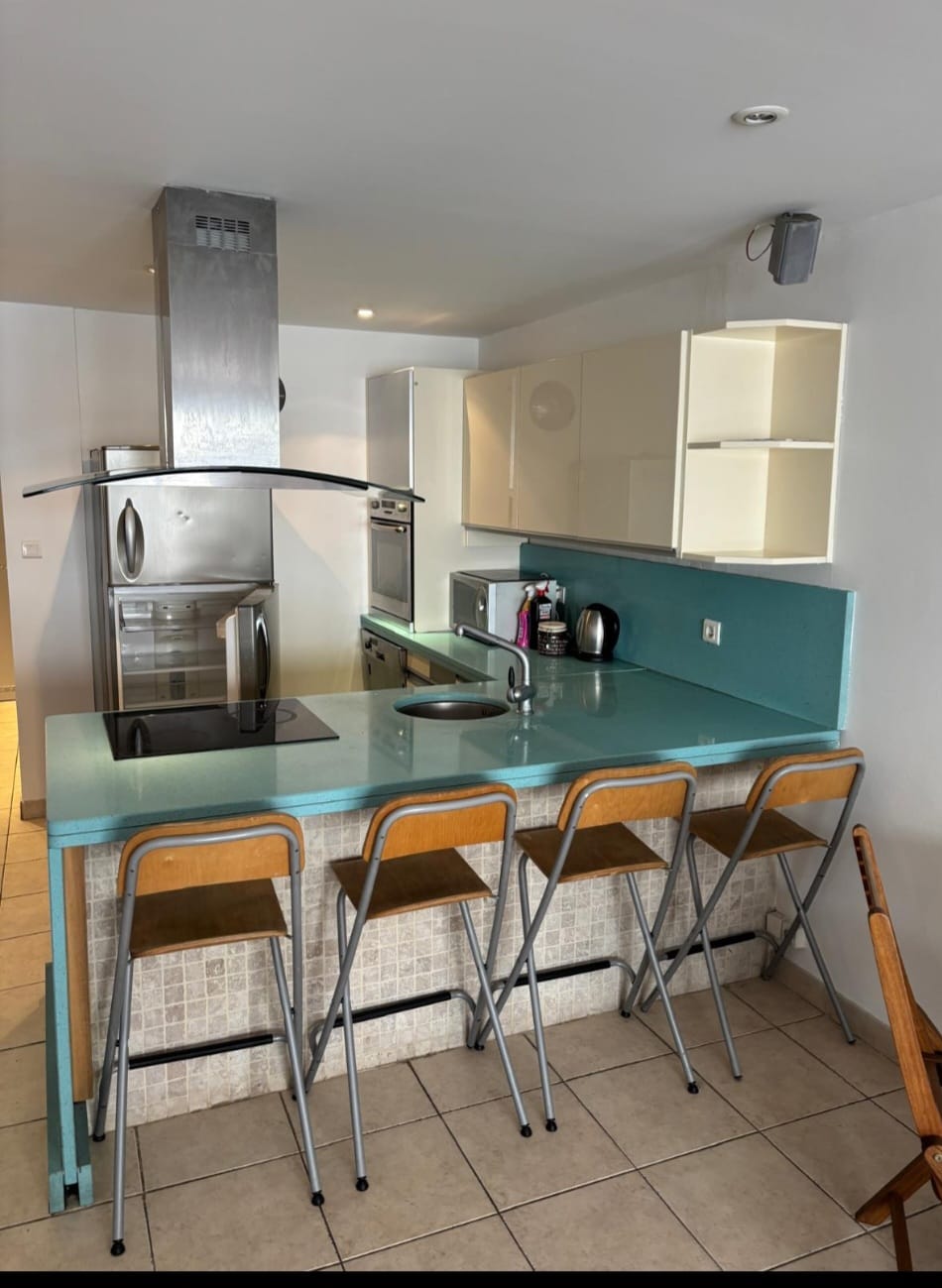 Un séjour spacieux avec cuisine américaine entièrement équipée, ouverte sur le salon