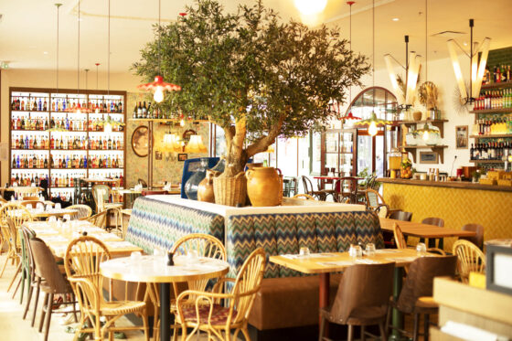 Dans cet espace lumineux aux larges baies vitrées, le mobilier rétro s’harmonise avec des murs en briques, du marbre de Carrare, du papier peint aux motifs géométriques et des luminaires des années 60.